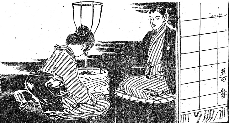 | 説明 | 東京は芝公園に隣接した広壮な住宅に、真冬の夜も更けてから、巡査の目を遁(ノガ)れて飛び込んできた謎の美女、というのが話の糸口。「年の頃二十歳前後、睫毛の長いぱっちりとした目許に、言いしれぬ愛嬌が含まれている。美しい眉、匂やかな唇、色はきわめて白く、生え際がぱっと濃くて、頭は瀟洒(サッパリ)した束髪。縞御召の柄よき小袖に繻子の帯。艶やかな桃や桜の花に較べんよりは、塵に汚れぬ白百合の神々しいのに似ていると言うが適当らしい姿」とは最高級の讃辞だ。この女性の束髪は第1,3,4回とではいくぶんちがって見えるが、全体としてかなり膨らみをもってきていることがわかる。第3回のシルエットでは髱(タボ=後ろ髪)が長く伸びて、前髪の小さかったこの時期だと、芸者の結う潰し島田と見紛うほどだ。(大丸 弘) |