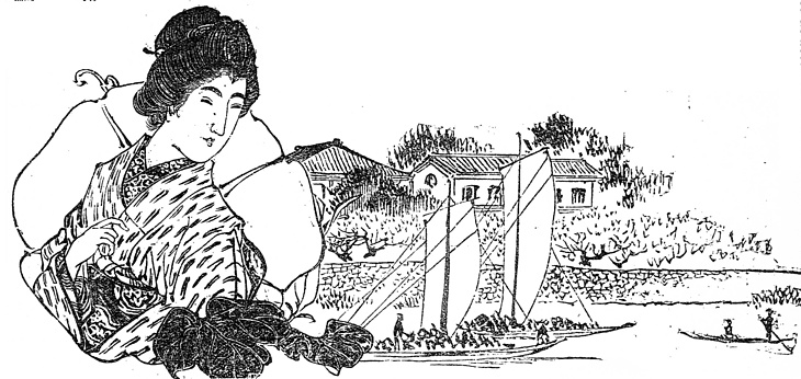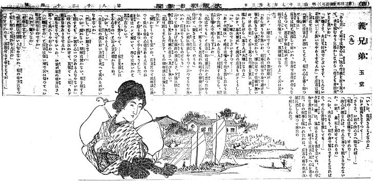 説明 ヒロインは「美しいというより寧ろすごいほどの美人、艶のある髪を流行の花月巻にして、香(カオ)り溢(コボ)るる桃色のリボンの釵(カザシ)」という説明のある美女。花月巻はこの一,二年で流行に乗った束髪の一種で、あたまに船を載せたように前後に膨らみをもつ髪型。前の膨らみがやがて廂髪(庇髪)(ヒサシガミ)と呼ばれるようになる。第1回の挿絵では画家の不注意か、髪が背後の夜の闇に紛れてしまってまったくわからない。第9回では前髪から鬢(ビン=横髪)、髱(タボ=後ろ髪)にあたる周囲はよくわかるが、この名称の起こりになったという頭頂の髷部分はよく見えない。ただし、挿絵画家の知識や再現力を100%信用することはもちろん正しくないだろう。第1回で、この美女と逢い引きしている白絣のきものの男性が、本文には「縞スコッチの背広服」とあるのだから。(大丸 弘)
