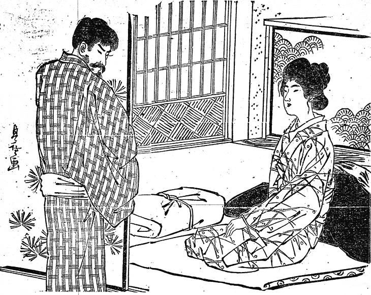 | 説明 | 肺結核で床を離れられない妻と、神経衰弱のため休職中の夫。この妻は家つきの娘だが、官吏の夫が公務で一年間の台湾出張中に、出入りの医師と不倫の関係を持ち、帰国後それを知った夫は妻に近寄ることがない。第12回は、話したいことがあるという妻の強い求めで久しぶりに顔を見合わす夫婦。妻は布団にもうシーツを敷いているが、この時代のシーツは幅が狭く、上下に折り込むだけ。かたわらの大きな枕は、病人が「高うしてある枕によりかかり」とあるように、座布団などを丸めて病人用にこしらえたもの。妻の束髪はこの時代の特色で前髪と髱(タボ=後ろ髪)が大きく、また髷をやや複雑に結んでいる。名前ばかりが有名で、具体的にはもうひとつはっきりしない花月巻という結び方も、この種のものだったか。(大丸 弘) |