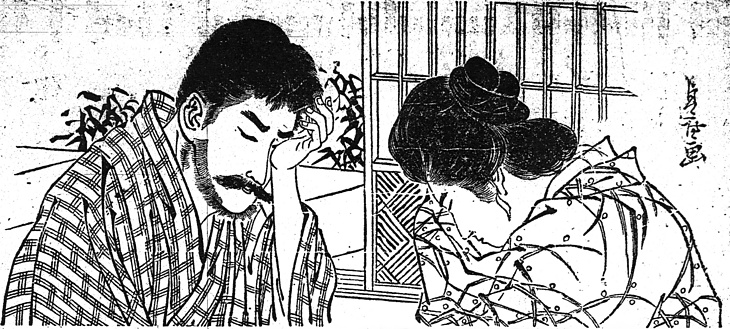 | 説明 | 肺結核で床を離れられない妻と、神経衰弱のため休職中の夫。この妻は家つきの娘だが、官吏の夫が公務で一年間の台湾出張中に、出入りの医師と不倫の関係を持ち、帰国後それを知った夫は妻に近寄ることがない。第12回は、話したいことがあるという妻の強い求めで久しぶりに顔を見合わす夫婦。妻は布団にもうシーツを敷いているが、この時代のシーツは幅が狭く、上下に折り込むだけ。かたわらの大きな枕は、病人が「高うしてある枕によりかかり」とあるように、座布団などを丸めて病人用にこしらえたもの。妻の束髪はこの時代の特色で前髪と髱(タボ=後ろ髪)が大きく、また髷をやや複雑に結んでいる。名前ばかりが有名で、具体的にはもうひとつはっきりしない花月巻という結び方も、この種のものだったか。(大丸 弘) |