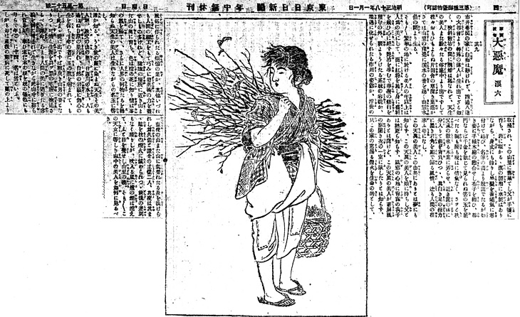 説明 山家育ちの美女が世に出ての変貌を描いた、村上浪六らしい伝奇的作品。この作品では、挿絵を[都新聞]の松本洗耳が描いているため、その美女は目と目の寄った、鼻の肉太な「洗耳顔」になった。挿絵付き小説に出遅れた[日日新聞]は、良い専属画家を抱えることができず、他社の絵描きが入れ替わりにアルバイト仕事をしている期間が長く続く。洗耳も[日日新聞]では署名をしていない。(大丸 弘)
