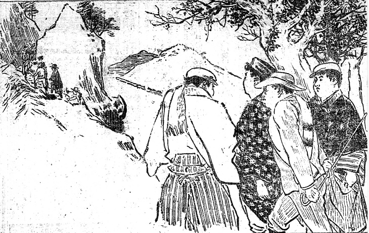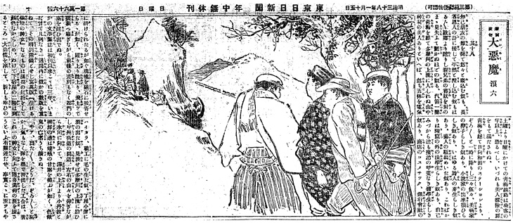 | 説明 | この時代の若者の風態を概括している情景といえよう。ある文芸雑誌が奥多摩に住むという十四歳の乙女を、「生ける仙境の神女」と紹介したため、天下の遊民のあいだにパニックが生じた。第17回は五人の閑人たちが火鉢を囲んでその噂に興じている様子。次の第18回ではそういった連中が、ツチノコ探しにでも行くように、連れだって奥秩父の山道をたどるありさま。本文によると、小説家の出来損ない、詩人の芽生え、駆け出しの芸人、法科大学生、医学生、といった書生の範疇に入る若者のほか、織工や丁稚小僧とまでいっているので、この時代の若者全体としかいいようがない。第17回と第18回にあきらかに共通する人間は、鳥打帽を横被りにし、首に襟巻、小倉の袴を穿いた男一人。山歩きの恰好に用意らしいものはないが、四人のうち洋服はニッカーズを穿いた一人だけ、きもの三人のうち袴以外の二人は裾をまくり、四人ともマチマチの帽子を被っている。(大丸 弘) |