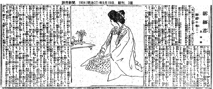 説明 これらはいずれも、ことし十八になる女性の、家での恰好で、あたまは束髪、たぶん絣風の柄のきものの上に着ているのは被布。ふつうのきものとちがって胸元を塞ぐ竪襟部分をもつ被布は、子どもから老人までのどんな年齢にでも、家居にも外出にも着られる便利な衣服だが、身体の線はすっかり隠れてしまうので、色気のあるものでも華やかなものでもない。結婚嫌い、ということがメインテーマになっているこの娘に着せたのには、そんな理由があるのかもしれない。また束髪はこの時代ずいぶん大きく膨らんで、すでに廂(庇)(ヒサシ)といっていいくらいの突き出しを見せている例(第1回,第22回)や、前髪部分が非常に盛り上がっている例(第17回,第31回)がある。(大丸 弘)