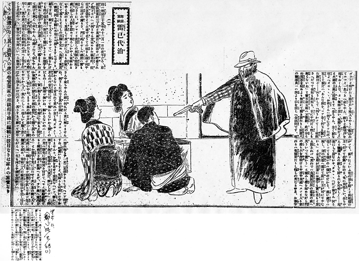 説明 深夜、芸者屋へ入った強盗が、家人へ拳銃を突きつけて脅している。ところは東京築地の新富町。こんな芝居の舞台のような強盗は現代では滅多にないだろうが、明治のことに前半期にはけっこう多かったらしい。強盗がこの家をあとにしてからのことを書いた四日後の新聞に「黒の二重廻しを着し、同じ色の中折帽子をかぶりたる男が大なり風呂敷包みを抱え来たりて、車夫に、貴様大急ぎで己を乗せてゆけ、と言える挙動いかにも怪しかりければ(……)」、警官に眼をつけられた、となっている。この時代、家にある金目のものの第一は衣類だったため、大風呂敷は泥棒にとっては仕方なかったが、警官にとっては不審者のいちばんの特色だった。二人の芸者の髪は芸者島田。なお家人を縛るために女の締めていたしごきを使っているが、第1回では副帯(シタオビ)といい、第2回の中では副帯(シゴキ)とルビを振っている。(大丸 弘)