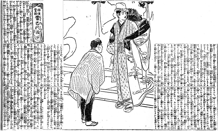 説明 [都新聞]の売り物、犯罪実話は十年以上人気を保ち続けたが、「雷巳代治」はその最後の方の作品。富岡永洗がきぬぎぬの別れの場面を描いている。出所したての巳代治が廓(クルワ)のなじみの花魁(オイラン)、若竹に久しぶりに会い、別れを惜しむ。見世の式台まで送りに出た若竹は、牛太郞と呼ばれる見世の若い者の前もかまわずに、「しかけ」(=裲襠(ウチカケ))を広げて男の身体を包み、背中に顔を伏せている。この客は、警察に追われて明日の身が知れぬ男だから格別だろうが、こんな場面でも、うぬぼれ客の心をくすぐったにちがいない。男がいま足に引っ掛けようとしているのは流行の下駄――堂島である。彼は羽織ときものも対であって、出所したての人間が札びらを切っているのには訳がありそうだ。(大丸 弘)
