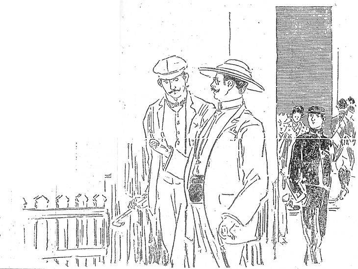 | 説明 | 真夏の東京・上野駅構内、二人の紳士は、このあと登場する主要人物の紹介役。「両人(フタリ)とも白地薄羅紗のサックコート。(……)年長(トシウエ)の紳士は鼻眼鏡に鼠サックのヘルメット帽、年少(トシワカ)の紳士は黒琥珀の深形の運動帽を冠っている」。洋装にはかならず帽子を被ることになっていたこの時代は、帽子のヴァラエティは豊か。ヘルメットはいまではすっかりサファリルックになったが、このころは夏の帽子として流行スタイルが百貨店カタログにも紹介されている。鼻眼鏡も1910年代まで。ふたりともYシャツのスタンドカラーがずいぶん高い。これは取り外せて、別々に売られていた。頻繁に洗うのはカラーだけ。(大丸 弘) |