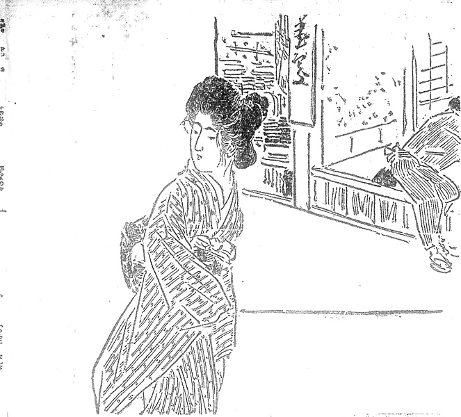 | 説明 | 華族には旧公卿家と旧大名家のほかに、維新や、その後の政治的社会的功績によって爵位を賜った新華族といわれる家があった。身の栄達という点からいえば官位より勲章より爵位を得ることに優る誇りはない、と考える人も多く、この物語はそういうひとりの人物を描いている。第2回は嫌がる妻を老母と一緒になって無理やりに汽車に乗せようとしている伯爵。この作品では若い女性が忠実に皆、この伯爵夫人と同じ髪型をしている。前髪が高く、髱(タボ=後ろ髪)は襟足にかぶさるくらいで、後頭部にかなり技巧的に髪を捻ったかたちの髷が見える。いわゆる花月巻の系統のもの、と考えられる。(大丸 弘) |