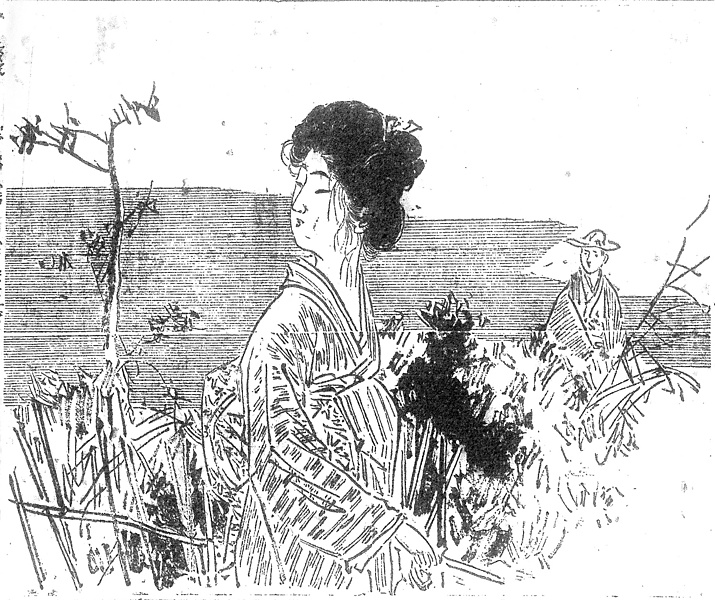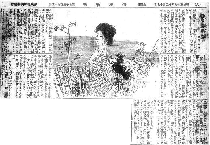 説明 第11回は村はずれの医師のもとを訪れての帰りのヒロイン、第22回は道で難儀を蒙ったところに来合わせて、救ってもらった礼に、ひとりの青年の家を尋ねるヒロイン、第25回では、身を寄せている家の女主から、身に覚えのない疑いをかけられて悲しむ。この三場面でヒロインの着ている羽織ときものは、似ているようでいてすべて違う。落魄したもと地方名士の娘、という女性が、第25回ではダイヤの指輪をしていることを見咎められる。ストーリーと挿絵にやや納得しにくい点があるのだが、画家の筒井年峯が、そんなことを承知の上で描いているのかどうか判らない。束髪はすべて毛が乱れていて手入れが悪いようだが、油をほとんど使わない束髪は、こんな風に乱れ毛のあるのが特色といってよく、束髪の評判の良くない理由でもあった。(大丸 弘)