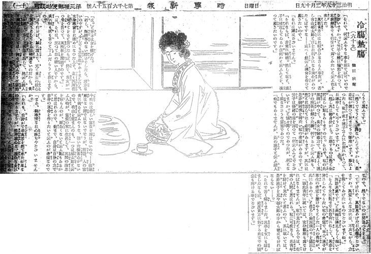 | 説明 | 第31回と第39回とは同じ場面、第69回は時間を隔てたべつの場面だが、若い女性の恰好は同じように見える。「変わり柄の銘仙に、なにか更紗小紋の羽織を着けて、アタマの束髪に薄い紫のリボン」。前の二回は瀬戸物の火鉢を隔てて父親と話している。小紋の羽織は挿絵では無地に描いている。これは当然のことで、しばしば挿絵に細かな柄が描き込まれることがあるが、それをリアルサイズに拡大したらミカンかリンゴくらいの大きさの柄になってしまう。挿絵というものはしょせん記号と理解するものだろう。一般論としてだが自由結婚を口にして父親に激怒されるお嬢様は、前の盛り上がったこの時期の束髪。髱(タボ=後ろ髪)も伸びているので、第39回などは知らない人は日本髪と見紛いそうだ。(大丸 弘) |