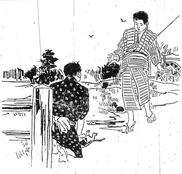 | 説明 | 十三,四歳の少年ふたりの争い。ひとりが子犬を流れに抛り込もうとし、立っているひとりがそれを止めようとしている。明治時代の男の子のきものといえば木綿の絣に決まっていた。絣のきものはいかにも男の子っぽく、また二十歳を過ぎた青年が着るといかにも若い男っぽく見えた。1910年代頃までは地方ではまだ手織がさかんだった。子どもの着るものは母親の手織、ということが多く、その思い出をもつ人は昭和に入ってからもいた。手織木綿はたいていは縞物だったから、商品化して名前の付いた縞でない、名前の付けようのない独創的な縞もあったにちがいない。子犬を抑えている少年は紺絣、立っている少年はたぶん手織縞を着て、子どもらしい肩揚げ、腰揚げがよくわかる。(大丸 弘) |