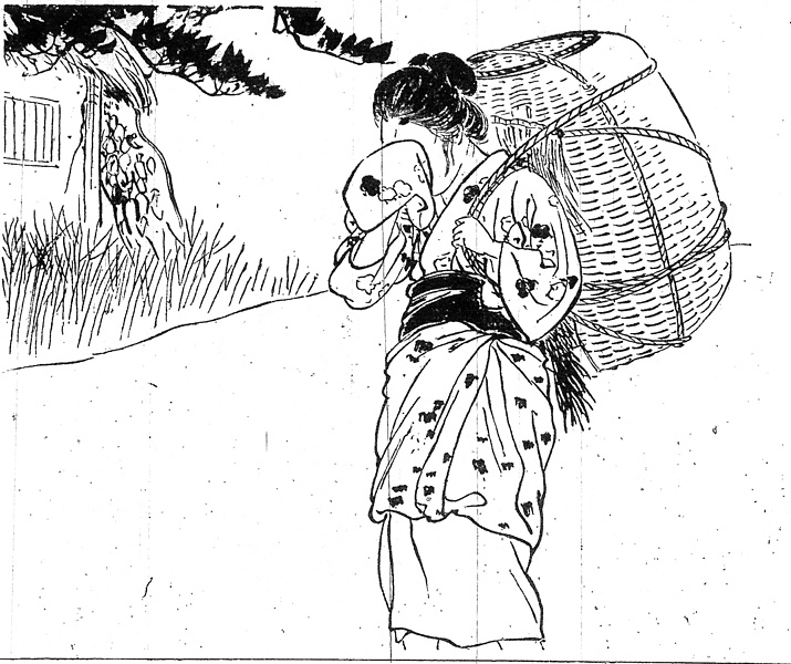 | 説明 | タイトルどおりの、ことし十八になる漁師の娘。浜に打ち上げられた父親の死体を発見し、魚籠に入れて泣く泣く運んでゆく。父親を入れるにしては籠の口が少し小さすぎるようだが、この娘は何人力かの大力なので、担ぐことはなんの苦もないようだ。千鳥柄の染め単衣などを着、帯も三尺帯ではなくしっかりした地質らしい細帯を締めているのは、海水浴客の世話という仕事を持っているため。裾は端折って帯に挟み、白い湯文字(ユモジ)を見せている。頭は小さな銀杏返し風。銀杏返しはきわめて融通の利く、ヴァラエティに富んだ髪型だ。(大丸 弘) |