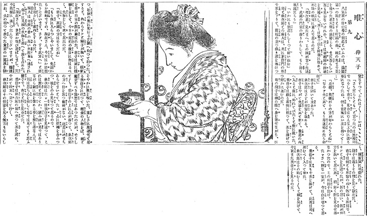 | 説明 | 来客のために茶を運んでいるこの家の娘。目白台に、老大樹の茂る庭に囲まれた別荘を持つという富豪の家つき娘で、心優しい女性だが、不幸なことに容姿に恵まれていない。金持ち娘で不器量というと、自分の立場を鼻にかける意地悪な娘、という設定になりがちだが、このヒロインは、自分の器量の悪さをいつも引け目に感じている引っ込み思案な娘。この時代、不器量というと、例の女中顔か、痩せてぎすぎすして目の吊り上がったような顔にするのがふつうだった。けれどもそれでは読者の同情を得にくいという考えからか、丸々と肥えたお嬢さま――それも少しばかり肥えすぎた――というのがこのヒロイン。挿絵の右田年英は浮世絵師の系統に立つ人ではあるが、この時代の挿絵画家の中では飛び抜けた写実力を持っているので、そういう気の毒なお嬢さまをじつに巧みに描きだしている。(大丸 弘) |