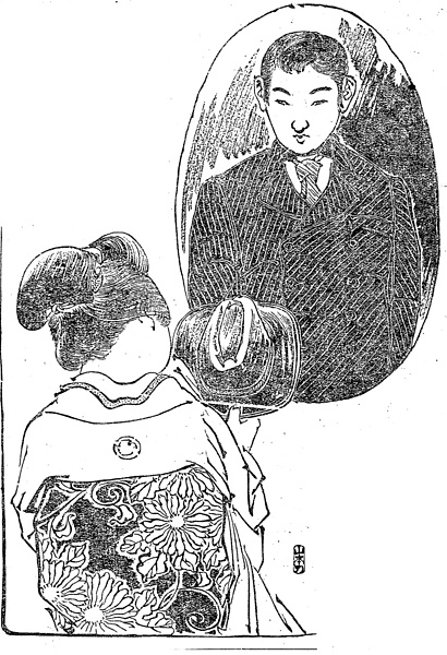 | 説明 | 姑から、肥りすぎを不器量と言い立てられて一旦は離婚になった妻が、その姑の、人が変わったような悔悟によって、めでたく元の鞘に収まる。「人は眉目(ミメ)より唯心」という結論がこの物語のタイトルになっている。友人から、この頃はたいそうお痩せになったといわれているものの、それほどには見えないヒロインが、出勤の夫に帽子を手渡している。銀行の平社員にすぎない夫の通勤着がフロックコートなのは、この時代ではあたりまえのこと。しかしスタンドカラーが色物であるのはめずらしい。中折帽子を差し出している妻が大丸髷なのは当然。髷は若い人ほど大きくするが、その人の体格にもよるので、この女性だったら、もっともおおきな「司」という髷形を使っているにちがいない。(大丸 弘) |