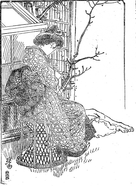 | 説明 | 第6回は子爵家のパーティーに招かれた折だが、第12回,第22回によると、これはこの娘のいつもの外出の装いらしい。菜の花が咲いている早春なので綿入の二枚襲だろう。この時代はこれまでの三枚襲が特別の場合以外廃れはじめていた。とりわけ年若の娘は、重くて窮屈な襲衣裳を嫌ったが、襟元や袂、裾の広がりに覗く何枚かの色調の重なり具合は、見馴れた人にはいかにも華やか見えたものだろう。第6回の絵では、裾廻しの濃い色合いの効果がよく見てとれる。この娘の束髪は、すでに廂髪(庇髪)(ヒサシガミ)といってよい形をとっている。何々巻といった呼び名は新聞や雑誌にはよく見かけるが、後頭部だけのことでもあり、見る人にはほとんど区別されなかったにちがいない。むしろ髷の根に挿す造花やリボンの華やかさが目立つ。この頃は女学校でも、造花コースの人気は刺繍や編物以上だった。(大丸 弘) |