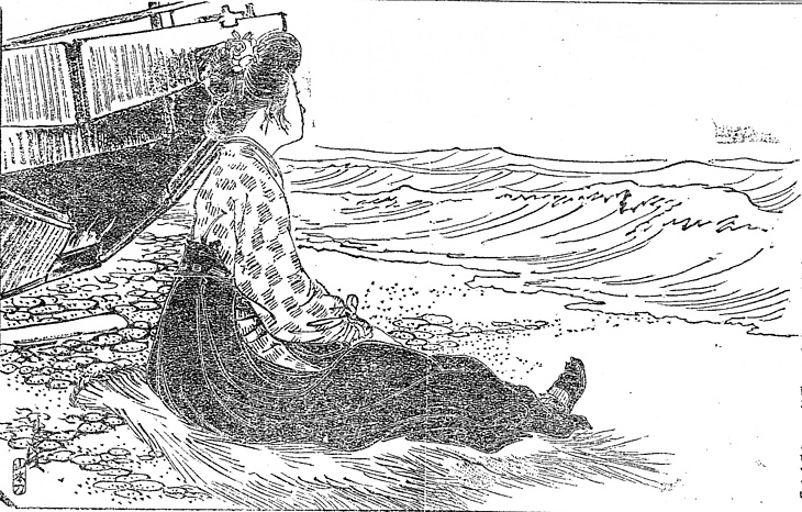 | 説明 | 「筒袖に袴を穿ち」、砂の上に足を投げだして物思いにふけるヒロイン。挿絵では筵(ムシロ)めいたものを描いているが、本文どおり海岸の砂の上でも砂利の上でも、それほど気にせず座り込めるのが袴の徳だ。女学生の海老茶や紫の袴は、どうかするとなにかプレステージめいたものを持たされるが、本来の目的は、満員電車での通学にも体操にも都合のよい実用着なのだ。たいていは一枚しか持っていなかったから、滅多に洗うこともなく、ずいぶん汚いものもあったようで、海老茶などという色はその汚れを隠すのに向いているのだ、という見方もあった。(大丸 弘) |