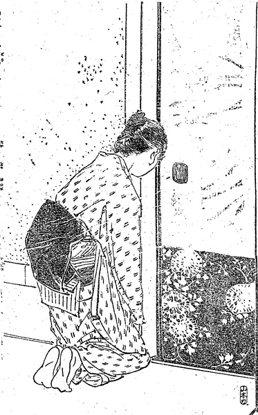 | 説明 | 襖の外から来客にものをいう召使い。この女性はおそらく四十代だろうが、変わった髪型をしている。髱(タボ=後ろ髪)をほとんどとらずに髪を引き上げて、後頭部に結んでいる。鬢(ビン=横髪)も前髪も出していない。これは縦型束髪の英吉利巻に近く、1880年代後半の束髪の初期に、上巻、マーガレイトなどとともに紹介された、古いスタイルだ。束髪はもともと派手なものではないが、この時代には上にも周りにも突きだして、二百三高地とか、廂髪(庇髪)(ヒサシガミ)とかいうスタイルに人気があった。それに比べるとこの髪は、古風で、地味な髪だ。もっともこの時代以後、第二次世界大戦後まで一部に流行した夜会巻は、このスタイルの発展したもの。(大丸 弘) |