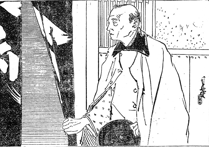 | 説明 | 大阪・船場の両替商の暖簾を押し分けているのは、靫(ウツボ)の塩物問屋の主人で、この家の親族の一人。「着たる外套は上がり口に脱ぎて、結城縞の裾短う、咳払いひとつして間の杉戸に手をかけ」という姿。結城は紬の上等品でちょっとした外出着としてこれ以上のものはない。手に持っているのは中折でなく黒の中山高帽らしい。上に着ている外套は商人などがよく着るモジリではなく二重外套のようだがはっきりしない。襟にラッコなどの毛皮をつけるのは、金歯や金縁眼鏡ほどでもないにしても、けっこう懐具合のいい旦那の印象を相手に与えた。(大丸 弘) |