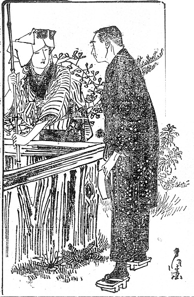 | 説明 | 物語発端の男女の出会い。女はいま井戸端で釣瓶棹を握っている。粗い子持縞の襟付きのきものの襟元に、若い娘らしい派手な半襟が覗いている。紺の前垂れ掛けで姉さん被り、襷掛けは、水仕事をする女の十人が十人の恰好。近寄って道を尋ねているのは、「絣の瓦斯二子上下揃ったのを着たのが、かちりと書生下駄踏み滑らしながら、指先で気色ばかり撮んだ中折帽子の縁を上げて(……)」。上下というのは羽織ときもの、揃いであると対(ツイ)という。若い男の紺絣の対は、篤実そうで、よいものだった。それに紺足袋、まな板のような安定のよい書生下駄。説明とちがい、挿絵では帽子を脱いでいるし、中折ではないようだ。(大丸 弘) |