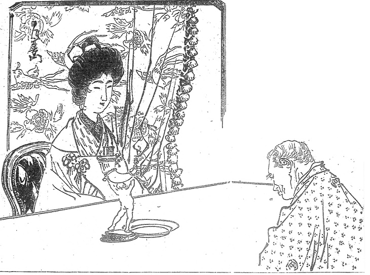 | 説明 | 子爵家の令嬢が、哀れな暮らしの下層民の救済について、危ぶむ老執事に訴えている。もっとも稲野年恒の描いたお嬢様は、もっと浮世離れしているように見えるが。令嬢の束髪は前方がいちじるしく盛り上がっている。この傾向は一,二年前からで、下田式、あるいは下田歌子式という人もある。また頭頂の髷も、半ばリボンに隠れているものの三角形に突き出していて、二百三高地風だ。お嬢様がきものの上に羽織っているのは被布。胸を塞ぐ竪襟(タテエリ)部分を持つことが和服としては例外的。その両側に飾り組紐がつき、大きな襟も特色のひとつ。(大丸 弘) |