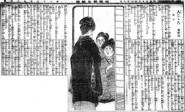 説明 明治時代は女学生がなにかと話題になった。知識をひけらかす生意気な小娘、のちの「新しい女」に通じるような自己主張の強さ、そしてその素行に対する疑い――。ここは女学生を客とする下宿の、待遇と監督についての悶着。下宿屋側の代表として乗り込んだのは三十がらみの人妻風の女性。黒紋付きの羽織に縞のきものの二枚襲。黒襟の掛かった縞のきものはもちろん礼服ではない。裕福な商家のお内儀、というところ。髪はこの年頃並みの髷の大きさの丸髷。それに立ち向かう女学生たちは、本文の「よくもこれだけ不恰好な女が集まったものだ」というように描かれ、この時代の偏見を示している。女学生の着ているものはさまざまだが、襟を寛げて、半襟を大きく見せるのがこのころのやり方。髪は第50回には日本髪らしいものも見られるが、束髪の髷はかなり高く盛り上がっているものがあり、二百三高地巻風。(大丸 弘)