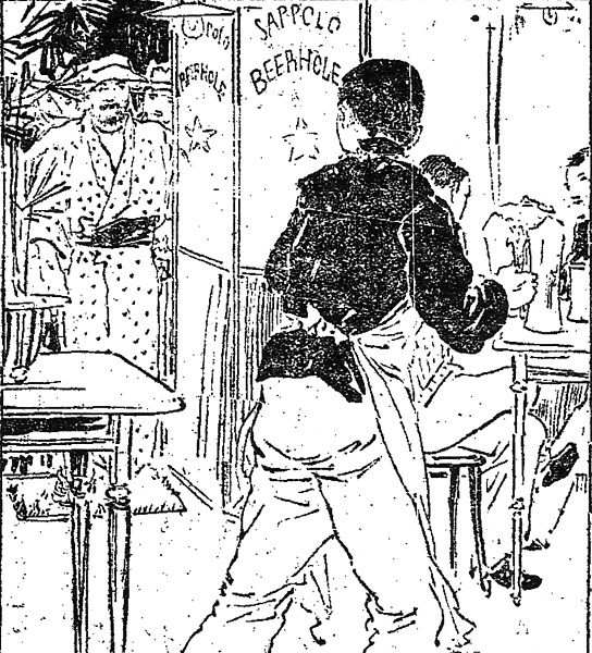 | キーワード | ビアホール;ビールジョッキ;給仕;後ろ姿;背面;客;テーブル;サッポロビールのスタンド看板 |