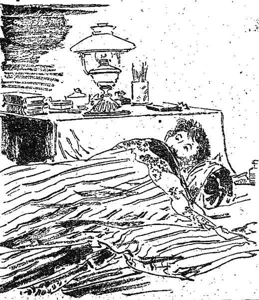 | キーワード | 眠れない様子;掻い巻き(かいまき);掛け布団;枕;薬瓶;飲み薬;ランプ;机;本;筆立て |
