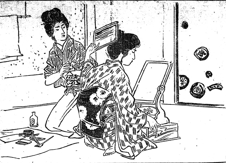 | 説明 | 鏡台を前にして、出入りの髪結にいま結い上げてもらった束髪の髷を、合わせ鏡で見ている女性。束髪を商売人の手で結わせる人はこの時代、そう多くない。結ってもらっているのは、手拭いが吊してあったり、壁の裾の部分に下張りがしてあったりするから、勝手もとに近い小部屋だろう。(大丸 弘) |
