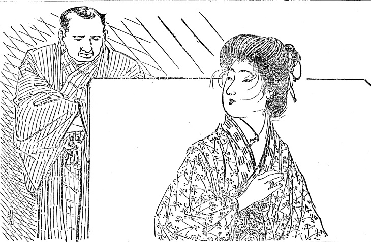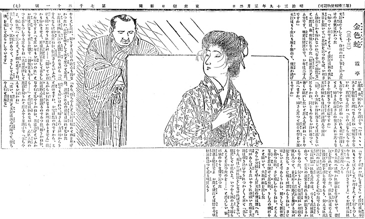 説明 日露戦争(1904年,1905年)の勝利で国中が浮き立っていた中で、新聞小説の中には戦後もの、とでもいうべきテーマがいくつか現れる。その中でもこの作品のような露探ものは、ほかには例がほとんどないが、見方によれば、将来の大陸ものにつながる要素を持っているともいえる。露探の疑いをうけた父親を持つ美しい姉妹、その姉が結婚を前にして急死する――。女学校を出た十八歳の姉と在学中の十六歳の妹の髪は、すでに廂髪(庇髪)(ヒサシガミ)風に前方にも横にも広がった束髪。ふたりともまだ肩揚げがあり、そのきもので目立つのは半襟についている金属製の襟留め。外出には二人とも毛糸編みやモヘア風の襟巻、肩掛けをしている。(大丸 弘)