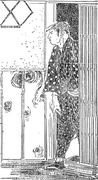 | 説明 | 初回は早春の東京上野山内の夜、手前に立ちはだかっている男は、「紺飛白の着物に紺飛白の羽織、太き洋杖(ステッキ)、鳥打帽子、三十年輩の老書生とも見える」。第2回ではこの男が山を下りて、同朋町のとある待合の玄関に姿を見せている。男の被っている鳥打は、耳覆いのあるいくぶん上等の品のようにも見えるが、いずれにせよ鳥打帽は帽子の中ではいちばん値段の安いもので、商店員や単純労働者に愛用され、欧米ではこのあと世界大戦を挟んで大流行する。紺絣と夏の白絣は、書生とかぎらず、小学生の男の子から二十代まで、若い男自身に好まれたばかりでなく、世間からも好ましいものと思われていた。紺絣のきものと羽織のお対(ツイ)も好まれたが、しかしきまりすぎていて、着る人によっては窮屈な印象もある。(大丸 弘) |