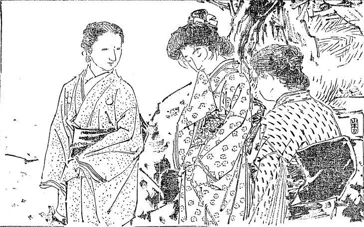 | 説明 | お見合いの場のお嬢さま。前が引き合わせ役の老婦人。従っているのは母親。娘が母親より大きいという現象は、この時代も話題になっている。お嬢さまの身につけているものはこの日の冒頭に詳しい。すぼめた黒の洋傘の握りに、薄色の絹ハンカチを掴んだまま、真珠に輝やく両の手を重ねて乗せている、と書いてあるが、挿絵では片手を袖に隠して口もとを押さえている。乙女の恥ずかしさの表現のきまり、というにしても、1906(明治39)年というまもなく大正というこの時代にしては、右田年英の勇み足ではないだろうか。「ふっくり取った廂髪(庇髪)(ヒサシガミ)に、勿忘草の束ねたのが物臆しげに哀れにふるえている」とある束髪の髷はかなり高く聳(ソビ)えていて、やや流行遅れになった二百三高地を思わせる。(大丸 弘) |