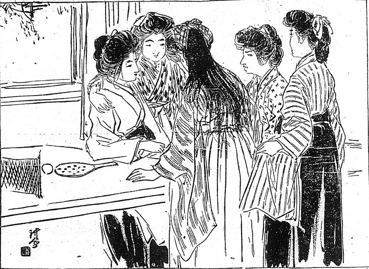 | 説明 | 女学校が舞台の物語なので、たくさんの女学生のスタイルが見られる。この場面は友人の一人が退学して結婚する、という情報をめぐって額を突き合わせているところ。だれもが髷の部分に大きなリボンを掛けていることや、中の一人は後髪を大きな輪に結んでいるらしいこと、もう一人は長く垂らしていることなどが、同じ束髪でも女学生風。作者の菊池幽芳は、娘たちの中の一人を「色は白いが顔に雀斑があって髪の毛の赤いのが蓮葉な声で(……)」と描写しているが、これはいかにも決まりきった組み合わせ。(大丸 弘) |