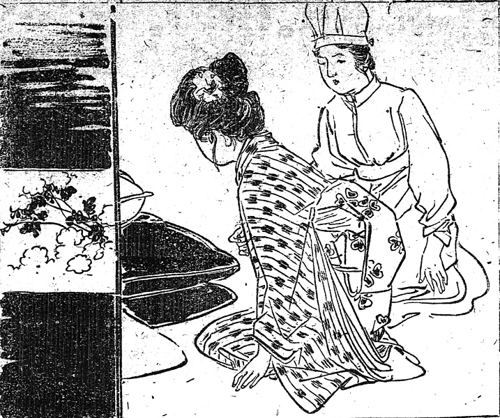 | 説明 | 長患いの母親の看病をしている娘。嫁ぎ先はすでに決まっていたのだが、肝心の相手が親に対する不満から家を出て、炭鉱で働いているという。寝ている母親は、自分には二人の娘が始終傍離れず看病してくれるし、それに看護婦さんもついていれば、大勢の召使いもいるのに、それでも心細いことがある、と言っている。付添看護婦はこのころ、はやりと言っていいくらい利用され、話題にもなっている。付添看護婦を利用する家庭が多かったのは、このころから女中が不足しはじめたためともいう。この挿絵では家庭でも病院内と同じ恰好だが、帽子まで被っていたのだろうか。娘の束髪は髷が突き出した、いわゆる二百三高地。(大丸 弘) |