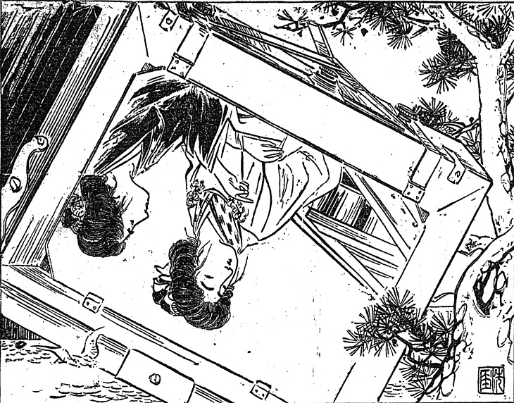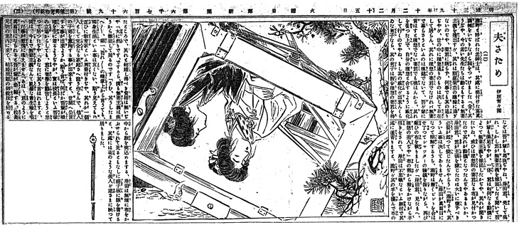説明 アマチュア写真家とその友人が、松島周遊中にレンズの中で発見した美女、「是や東北美人のモデルとも言うべき美形が、フッサリとした黒髪を束髪に束ねて身には矢絣の被布(ママ)をはおった肩付きに、犯すべからざる品格と威厳を備えて」いる女性。この夏、仙台の女子師範を卒業したばかりの才色兼備の教師、連れ立っているのは学校時代の舎監の老婦人。ふたりの束髪は、二百三高地髷の高さは共通しているが、舎監の老婦人は前髪が廂髪(庇髪)(ヒサシガミ)というほどには突き出ず、むしろ上に高く盛り上がっている。画家の絵がもし忠実ならば、舎監の束髪は下田歌子式といわれたやや古いスタイルに近い。この女性は羽織を着てショールを用い、下は袴で黒靴を履く。若い女性の被布は羽織より10センチほど長く、袴ではないようだが、第3回の挿絵によれば白っぽい靴を履いている。きもので、また被布で靴、というスタイルもあったと見える。第3回で向かい合っているのは旅館の男衆。(大丸 弘)