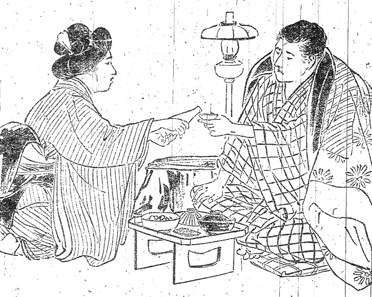 | キーワード | 格子のきもの;黒襟;掻い巻き(かいまき);一人膳;布団を引っかける;徳利(とっくり);お酌;竪縞のきもの;ランプ |