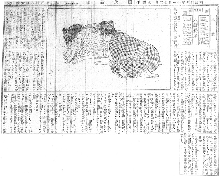 説明 東京にはこの時代まだ、江戸時代からそう変わってもいない総雪隠を持つ裏長屋が存在していた。婦人雑誌などで、ときおり下層社会探訪などといったルポの対象にもなっていた。作品の舞台は本所のそうした八軒長屋、そこにうら若い二人の廂髪(庇髪)(ヒサシガミ)が共同生活をしている、というのが謎。廂髪はすでに女学生の代名詞となっているが、このふたりは二十一と十八,九というのでいわゆる女学生上がり、という年齢。襟元の詰まった着方で細帯の胸高な締め様も女学生風。束髪の髷は三角錐に盛り上がって二百三高地の特色は残しているが、それよりもすでに廂髪という仇名が定着してしまったように、前、横への張り出しが目立って大きくなっている。束髪はもともとたいていは自分の手で、油も使わずまとめるものなので、落ち毛、後れ毛がうるさいのが特徴。第22回の二人のような、畳に這うような恰好は、現代の人であればかえって苦しいだろう。(大丸 弘)