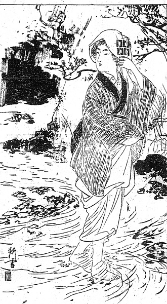 | 説明 | 山家育ちの美女が、たまたま訪れた都の貴公子に見いだされる、という筋書きはこの時代の新聞小説にわりあい多い。「その歌の主は年頃十八九、水と石との色に副(ソ)う手拭い目深に、冠り残した銀杏返しの髪の黒さ、紅い根掛け、紅い襟、紅い帯、片手に紅い裾をかかげて、せせらぐ水のなぶるに任せた脛(ハギ)白く」とある。この娘は玉子を抱えていたのだが、山中を行く車馬の列に驚いて、そのうちの三,四個を「友禅の前垂包」から取り落とした。挿絵ではわかりにくいが、裾をまくって前に挟み、その挟んだ辺りで前掛けに包んだ玉子を抱えている。前掛け、あるいは前垂れは下層階級の女性は日がな一日掛けていて、ちょっとしたものを持ち歩くにも風呂敷のように利用した。しかしもちろん友禅の前垂れとなると飾りのひとつでもあったろう。それにしてもこの時代の娘の身なりは紅いものずくめ。(大丸 弘) |