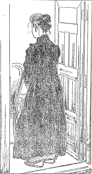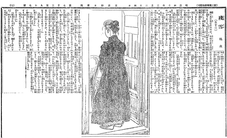 | 説明 | この時代の言い方をすれば慈善事業の、孤児収容施設の管理者である。ざらにある職業ではないから、作者の半井桃水は、あるいは取材をしているのかもしれない。「黒い毛繻子の筒袖外被(ウワッパリ)」というものが実際に存在したものかどうかは不明。もう少し後の時代になると、女性の職業服としてのいわゆるコート類が現れるが、それに比べると、看護服か洋尼風、というこのスタイルはかなり物々しい。(大丸 弘) |