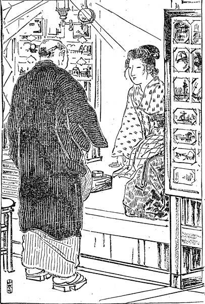 | キーワード | 絵はがき屋;店先;眉落とし;ボストンバッグ;芝翫下駄;ランプ |