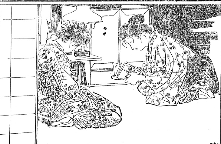 | 身装画像コード | D7jog:[女学生] D004:[適齢期の娘;新造;(1) 嫁入り前の娘,新妻,さらに一般の他家の妻女をいう。] D2hi:[束髪(庇髪など、後期平型の)] D1ka:[髪飾り(櫛,簪,リボン)] D3ob:[帯の締め方;帯の位置] Vta:[足袋] H000:[照明;照明具(一般)] |