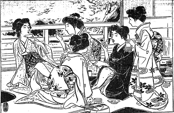 | 説明 | 四国の松山を舞台にした小説。前年に同じ松山を舞台にした漱石の『坊ちゃん』が評判を取っているので、それを当て込む気がいくぶんかあったかもしれない。この場面はお客の帰ってしまったあとの芸者たちの、だれ気兼ねない無礼講。右の一人だけが雛妓(オシャク)。この絵のように、芸者が出の装束のままで崩れたポーズをしていると、腰から下の前を割って裾を曳いた部分が扱いづらく、いかにも邪魔、という印象がある。曳裾は所詮立ち姿のものである。(大丸 弘) |