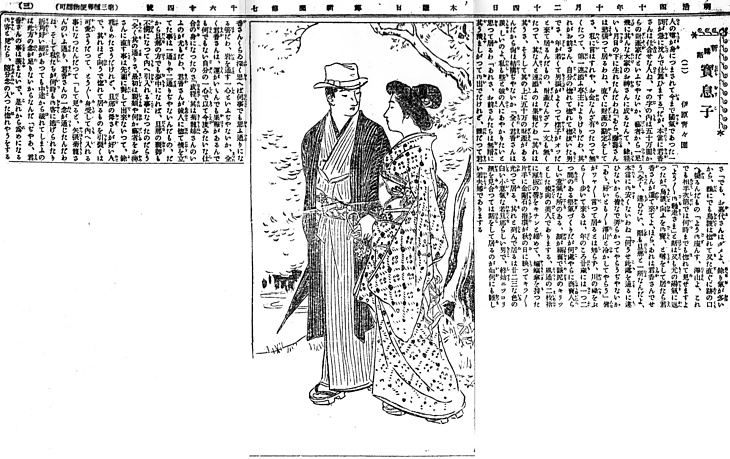 説明 晴れた秋の日の川縁を散策しているのは売れっ子の芸者と、その若い旦那。旦那は縞のきものに縞の羽織、変わり柄の角帯を締め、中折帽を被って両刳の駒下駄を履く。五十万と噂のある財産家の後継で、宝息子と渾名されている。その宝息子に手をとられている女は「顔が細面で目尻のキリッとした痩せ肉の美人(……)風通の二枚袷に厚板の帯をキチンと締めて、蝙蝠傘を持った片手に金剛石の指環が秋の日に映ってキラキラ光っている」。女はまもなく宝息子といっしょになる。芸者であるのに丸髷を結っているのは、旦那持ちの芸者のよくすることで、今日一日夫婦の気分を味わっているのだろう。本文中にも「堅気造りだがどこやらに商売人らしい意気な所のある」姿といっている。二枚袷は綿入に入る前の晩秋の恰好で、呉服屋も例年力を入れて宣伝した。風通は一枚のきれの表裏がべつの模様になる高級織物。よい天気らしいのにふたりとも、とくに男が蝙蝠傘を手にしているのは、この時代かなり多くの男性が、ステッキを放さなかったことと関係があるのだろうか。(大丸 弘)