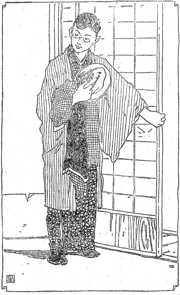 説明 東京で不自由もなく暮らしている二十二,三の男性、これといった決まった職業はない。この日の外出もこれといった目的はなく、ただ母にいわれた小さな用事で気が重い。本文には「手に鳥打帽子をなぶりながら」とあるが、挿絵は中折帽子になっている。鳥打と中折帽とでは主人公であるこの男の性格もこの日の気分も、いくぶん違うのだが。紺飛白らしいきものに縞の羽織、腕には二重外套を抱え、紺足袋を履いている。渡部審也の挿絵にはやや抽象的な表現部分があり、格子模様らしい外套の柄もそのひとつ。第1回では眼鏡を鼻眼鏡のように描き、第3回では縁を描き入れているのもそのひとつ。出がけに口をきいた母親は倅(セガレ)の「他所行きの羽織」を縫っている。中流以下の、ということはたいていの家では、男は礼服のほかに、ふだんの羽織と他所行きの羽織の二種類を持っていた。それに袷と綿入れとがあり、ほかに夏の単衣羽織を持てば、羽織だけでも女の仕事は楽ではない。(大丸 弘)