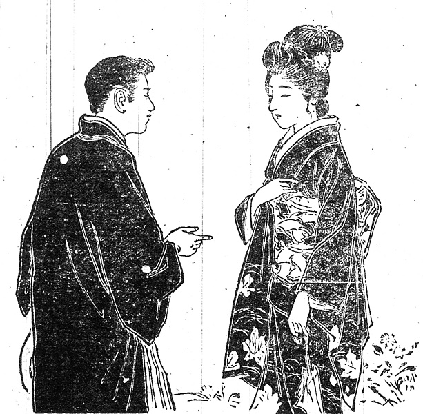 | 説明 | 関西の実業家の一人娘で、この時代としても古風な家風のもとに生い育った、まだ二十歳前の娘。第1回,第2回は大阪から京都までの汽車の車中。第12回はある園遊会。第22回は東京に住む危篤の叔父のもとに駆けつけるため、大阪駅で父親の指示を承っているところ。9月1日という残暑の日の、近距離の外出では、「浅黄地に白い絣の処々に入った絽の帷子、鼠地に牡丹の浮模様ある漣織の帯(……)」、関西では東京とちがって、盛夏には帷子を着る習慣が続いていた。園遊会では黒の裾模様、そして夏の旅装は「いつも旅行するときに着る綾織御召の単もの」に、薄いセル地の外套とある。夏の外套とはおそらく塵除けのコートだろう。その三つの場面で目立つのは、この令嬢の島田の髷の高さ。彼女はとりわけ美しい髪の持ち主であるらしく、「女の髪の美しいのを濡鴉(ヌレガラス)というが、是はそれ以上に艶のあるのを、庇髪(ヒサシガミ)でもあるまいというので、古風な高髷に結っている」と、その高髷の詳しい描写がつづく。べつのところで作者は、「さしずめ庇髪であるところを品の好い高髷に結った」という言い方もする。高髷――高島田自体が古風、ということと、嫁入りでもないのにこの高さが、もうこの時代では人目を惹くにちがいない。(大丸 弘) |