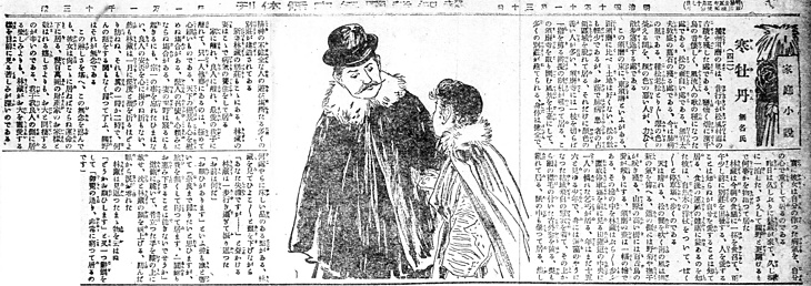 | 説明 | 紳士と、物乞いの少年。季節は野菊が枯れ残っている――というからほぼ新聞の刊行である11月の末と並行しているのだろう。少年は結城絣の破れた単衣物に、獺(カワウソ)の襟毛の付いた古外套を着ている――と書かれている。挿絵では、その外套とは引回しのマントのように見てとれる。紳士の着ている外套はふつう二重廻しと呼んでいたが、これも外套の一種である。この作品では水野年方の門下が挿絵を担当しているようだが、個人名はわからない。この時代ではよくあること。(大丸 弘) |