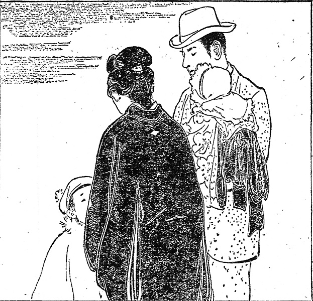 説明 五歳と当歳の子どもをともなって、天下茶屋の妻の実家を訪ねる夫婦。妻が黒紋付の羽織、当歳児に飾り帯を垂らした産着を着せているところを見ると、地方的には重んじられる新客の祝いではないにしても、やや改まった心持ちの訪問と見える。夫は中折帽に背広、妻の髪は当然丸髷。上の男の子は正チャン帽にマント、乳児は赤ちゃん用の襟付きフードを被っている。この種の可愛らしい子ども洋品は、この時代大きな呉服店や洋品店でさかんに宣伝し、よく売れたようだ。(大丸 弘)