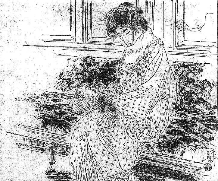 | 説明 | 二十五歳になるヒロインは、すでに五年以前に、婚礼の式と、一,二夜の同衾は済ませているという奇妙な状態の女性。御召の綿入れに紋縮緬の被布を着て、襟巻に首を埋めている。被布はこのまま家の中でも着ていられる衣服で、12月初旬の北国だが、旅に出るといっても、とくにこれ以上の防寒の方法はなかった。かたわらに置いてある提げものは、ここでは四季袋と言っているが、明治の中期以後女性に外出の機会が増えたのに伴い、信玄袋とか、いろいろな名称の似たような商品が考案され、さかんに宣伝された。口金の付いた、のちのハンドバッグ式のものが普及するのは、第一次大戦以後のことだろう。彼女の髪型はS巻の束髪とあるが、髪を捻って、真後ろから見て大きなSの字に似せるので、前からではわからない。真後ろを描いた第2回の絵でも、それほど真正直に、活字体のSに似せているわけでもないことがわかる。束髪は油をほとんどつけない人が多かったせいもあり、うるさいくらい、毛が顔にかかっているように描いている絵が多い。向かい側に座った学生帽の男はインバネスと本文にはある。ただし、この種の二重外套の呼称は作者によってマチマチ。(大丸 弘) |