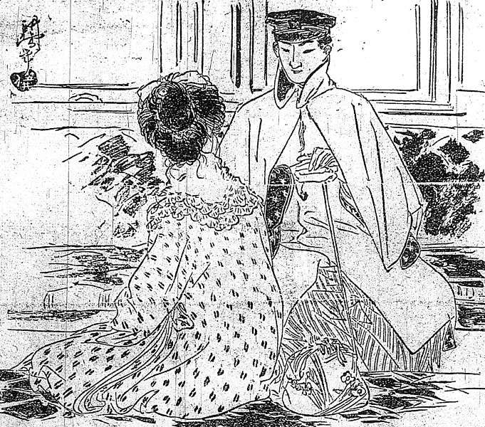 | 説明 | 二十五歳になるヒロインは、すでに五年以前に、婚礼の式と、一,二夜の同衾は済ませているという奇妙な状態の女性。御召の綿入れに紋縮緬の被布を着て、襟巻に首を埋めている。被布はこのまま家の中でも着ていられる衣服で、12月初冬の北国だが、旅に出ると言っても、とくにこれ以上の防寒の方法はなかった。かたわらに置いてある提げものは、ここでは四季袋と言っているが、明治の中期以後女性に外出の機会が増えたのに伴い、信玄袋とか、いろいろな名称の似たような商品が考案され、さかんに宣伝された。口金の付いた、のちのハンドバッグ式のものが普及するのは、第一次大戦以後のことだろう。彼女の髪型はS巻の束髪とあるが、髪を捻って、真後ろから見て大きなSの字に似せるので、前からではわからない。真後ろを描いた第2回の絵でも、それほど真正直に、活字体のSに似せているわけでもないことがわかる。束髪は油をほとんどつけない人が多かったせいもあり、うるさいくらい、毛が顔にかかっているように描いている絵が多い。向かい側に座った学生帽の男はインバネスと本文にはある。ただし、この種の二重外套の呼称は作者によってマチマチ。(大丸 弘) |