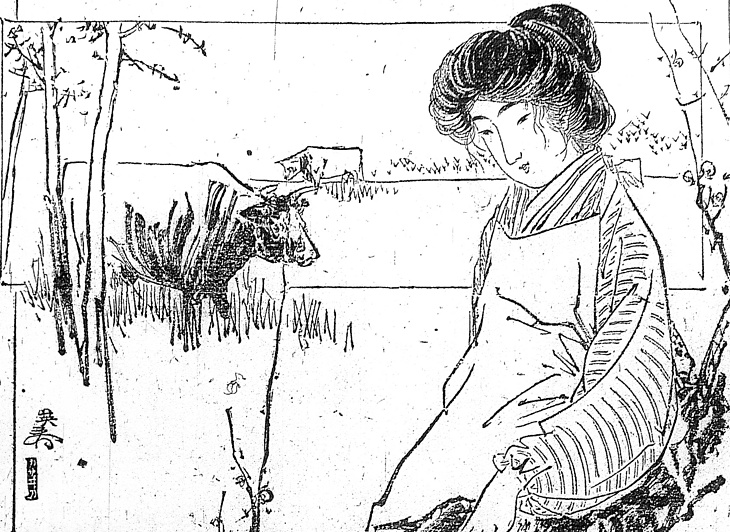 | 説明 | 東京の目白の辺りにあるらしい小牧場で、乳搾りをしている娘。襟元を見ると和服だが、筒袖の袖口は紐を通して絞っている。そしてその上に大きな白いエプロンをしている。きものは木綿の綿入れということなので、これはひとつの改良服ということになる。しかしこれではずいぶん袖が汚れるにちがいない。改良服の中途半端さの見本のよう。割烹着など、軽作業用の上っ張りが一般化するのは、もう少し後の時代になる。(大丸 弘) |