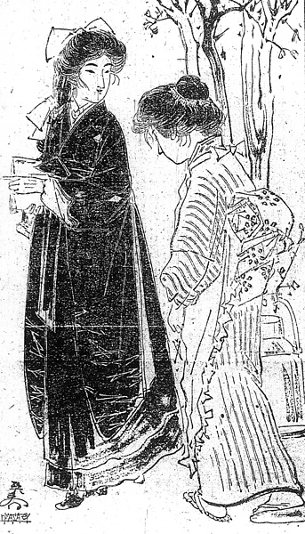 説明 家庭の都合で学校をやめた親しい友人を慰めるかつての学友。この心優しく、また美しいお嬢さまの髪はマーガレット。マーガレットは前から見たのではわからないが、三つ編みの先っぽうを上に折り返す単純なスタイルで、結び目に一,二カ所リボンを使う点が少女向きの髪、1880年代の、束髪の最初の導入期にすでに紹介されている。けれどもそれから二十年以上を経た今、束髪は平型の時代になっていて、前、横に拡がり、その点は不幸な学友の束髪とも同じ。お嬢さまの着付けは詳しい衣裳付けがあり、黒縮緬の五つ紋の大振袖のきものに、古代紫のカシミヤの袴を胸高く穿いている。今日は音楽の発表会というので盛装。襟には襟留めが見える。(大丸 弘)