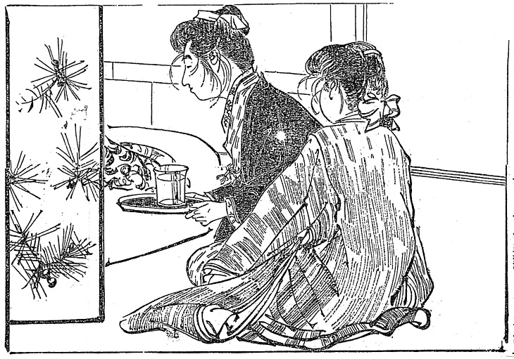 | キーワード | イギリス巻;リボン;黒紋付き羽織;竪縞の羽織;横座り;掛け布団;お盆;コップ |